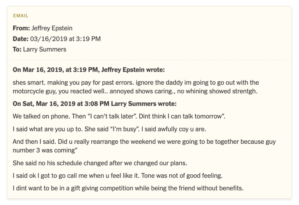 It’s worth pondering. Summers was President of Harvard, and is still a professor there. He was also Treasury Secretary. In other words, he looked like a Serious Figure — as indeed he was portrayed in the film The Social Network. And here he is discussing with Epstein how to manage a floozy with whom he was preoccupied.
