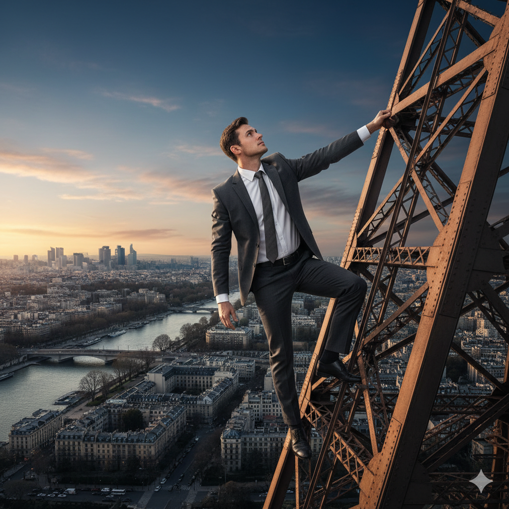 I was brooding on something that the French painter Paul Delaroche is reputed to have said after seeing one of the first daguerreotypes in the late 1830s or early 1840s: “From today painting is dead”. Given the astonishing computational power that my iPhone now brings to bear on every image snapped by its camera, I was playing with the idea of an analogous slogan — “After computation, photography is dead!” And then, just for fun, I told Google’s LLM Gemini to create “a photo-realistic image of a young man, dressed in a business suit, climbing up the outside of the Eiffel Tower”, and a few seconds later this was the result.