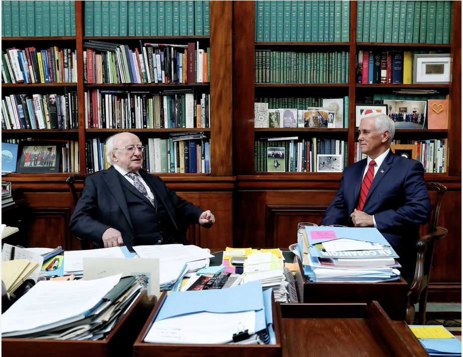 When US Vice-President Mike Pence came to Ireland there’s a photograph of him with Michael D. in the latter’s study in the presidential residence. It shows the two statesmen in a bookish study almost as untidy as mine!