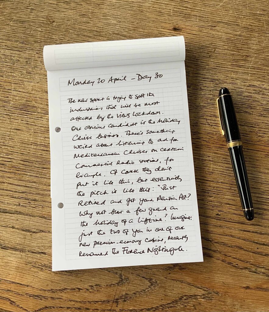 For the first 100 days of the COVID lockdown I kept an audio diary on this substack — transcripts of which I eventually published as a Kindle book, 100 Not Out. Searching through my files the other day, I came on one of the notebooks I used at the time. This is the entry for Day 30 — Monday 20th of April, 2020.