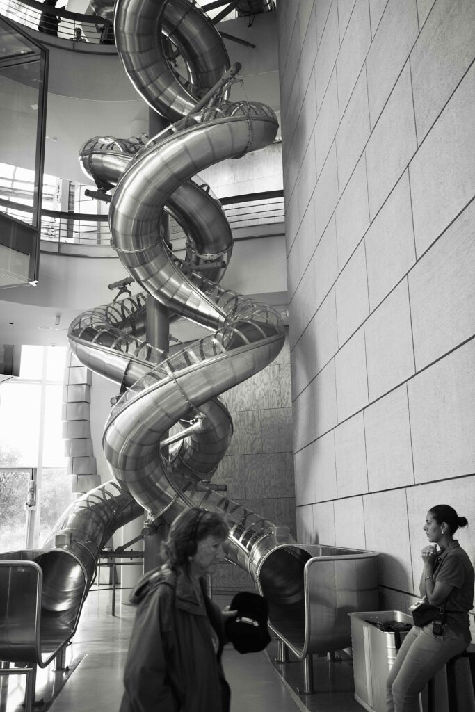 This was most evident in his early days through the deconstruction of his own staid Dutch colonial-style home in Santa Monica, whose façade he disrupted with jutting angles of glass, corrugated metal, plywood and chain-link fence. It was not pretty. But, as fellow architect Thom Mayne has commented, the use of inexpensive everyday materials in a city where properties easily go for $20 million was a critical statement about the house as a status symbol. Mayne thought the house was “very aggressive politically … using chain link is saying fuck you to marble.”